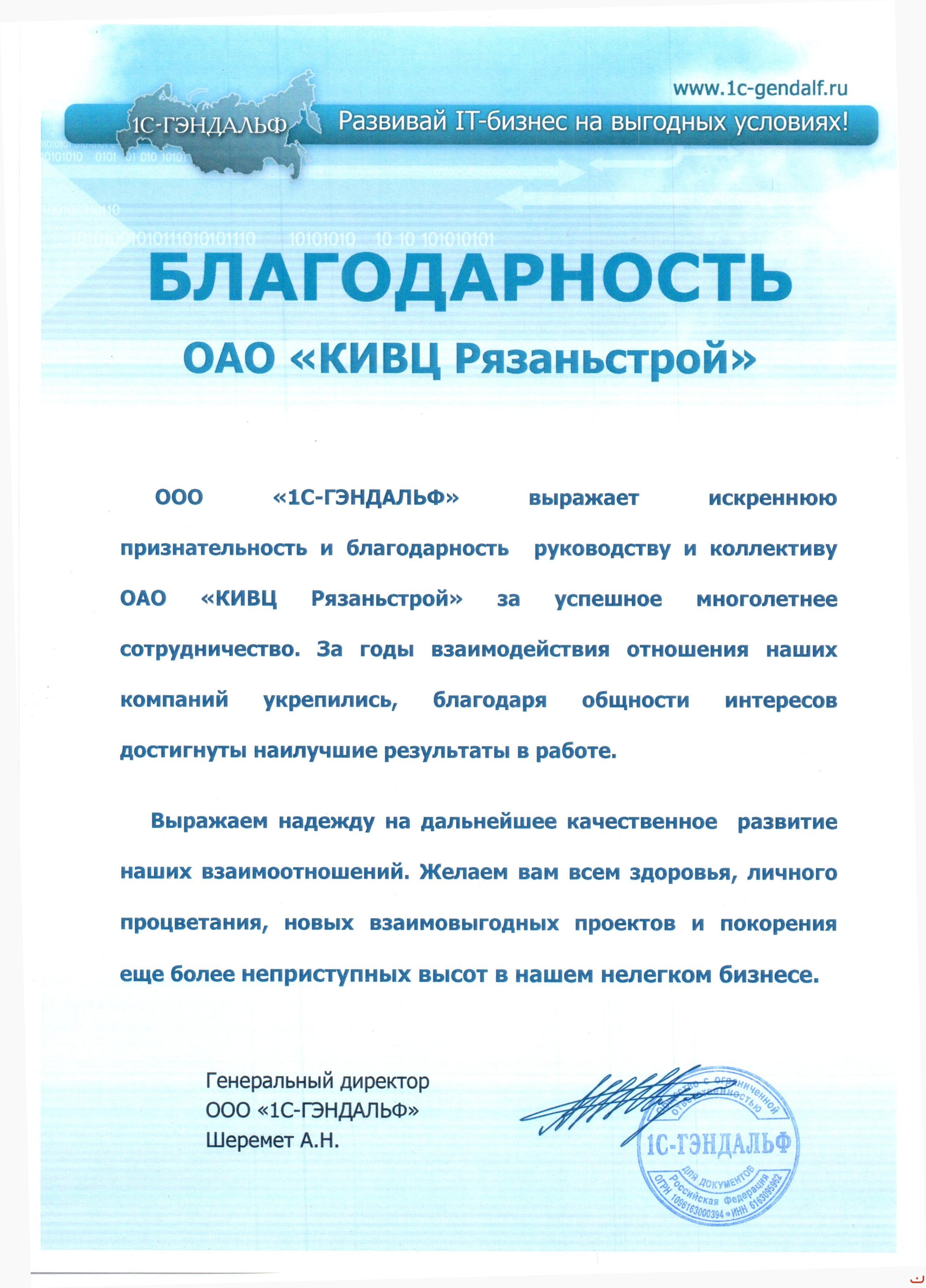ООО "1С-ГЭНДАЛЬФ" выражает искреннюю признательность и благодарность руководству и коллективу ОАО "КИВЦ Рязаньстрой" за успешное многолетнее сотрудничество. За годы взаимодействия отношения наших компаний укрепились, благодаря общности интересов достигнуты наилучшие результаты в работе. Выражаем надежду на дальнейшее качественное развитие наших взаимоотношений.