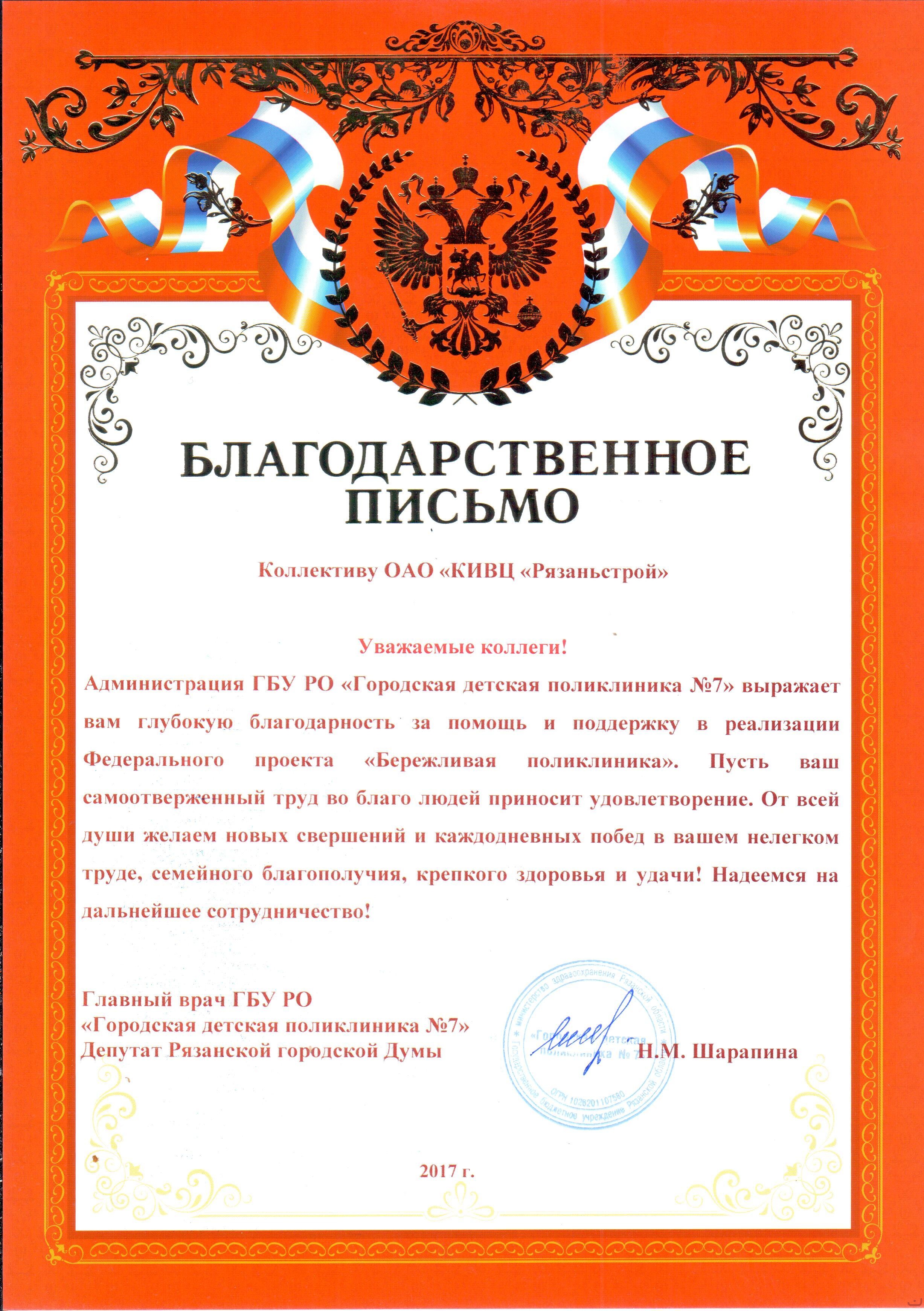 Филиал РТРС "Рязанский ОРТПЦ" выражает ОАО "КИВЦ Рязаньстрой" благодарность за качественное и своевременное оказание услуг по подготовке и проверке сметной документации. Итоги вашей деятельности позволяют нам лучше ориентироваться в специфике строительной отрасли, а так же избегать необоснованных финансовых затрат. Филиал РТРС "Рязанский ОРТПЦ" надеется на дальнейшее плодотворное сотрудничество в будущем. Администрация ГБУ РО "Городская детская поликлиника №7" выражает вам глубокую благодарность за помощь и поддержку в реализации Федерального проекта "Бережливая поликлиника".
