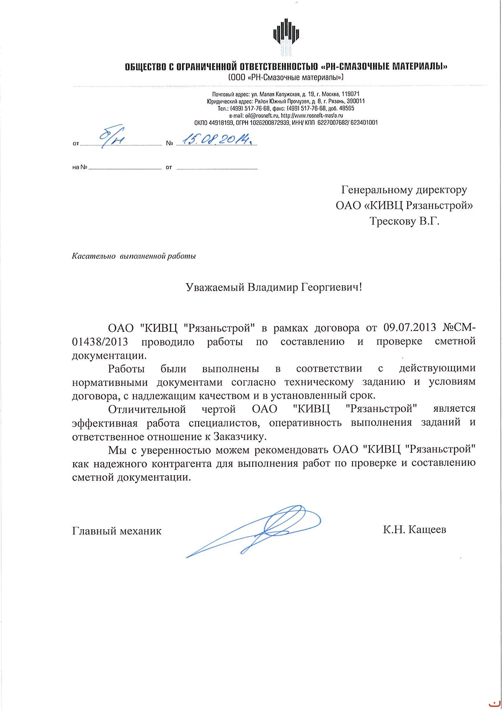 Отличительной чертой ОАО «КИВЦ «Рязаньстрой» является эффективная работа специалистов, оперативность выполнения заданий и ответственное отношение к заказчику. Мы с уверенностью можем рекомендовать ОАО «КИВЦ «Рязаньстрой» как надежного контрагента для выполнения работ по проверке и составлению сметной документации.